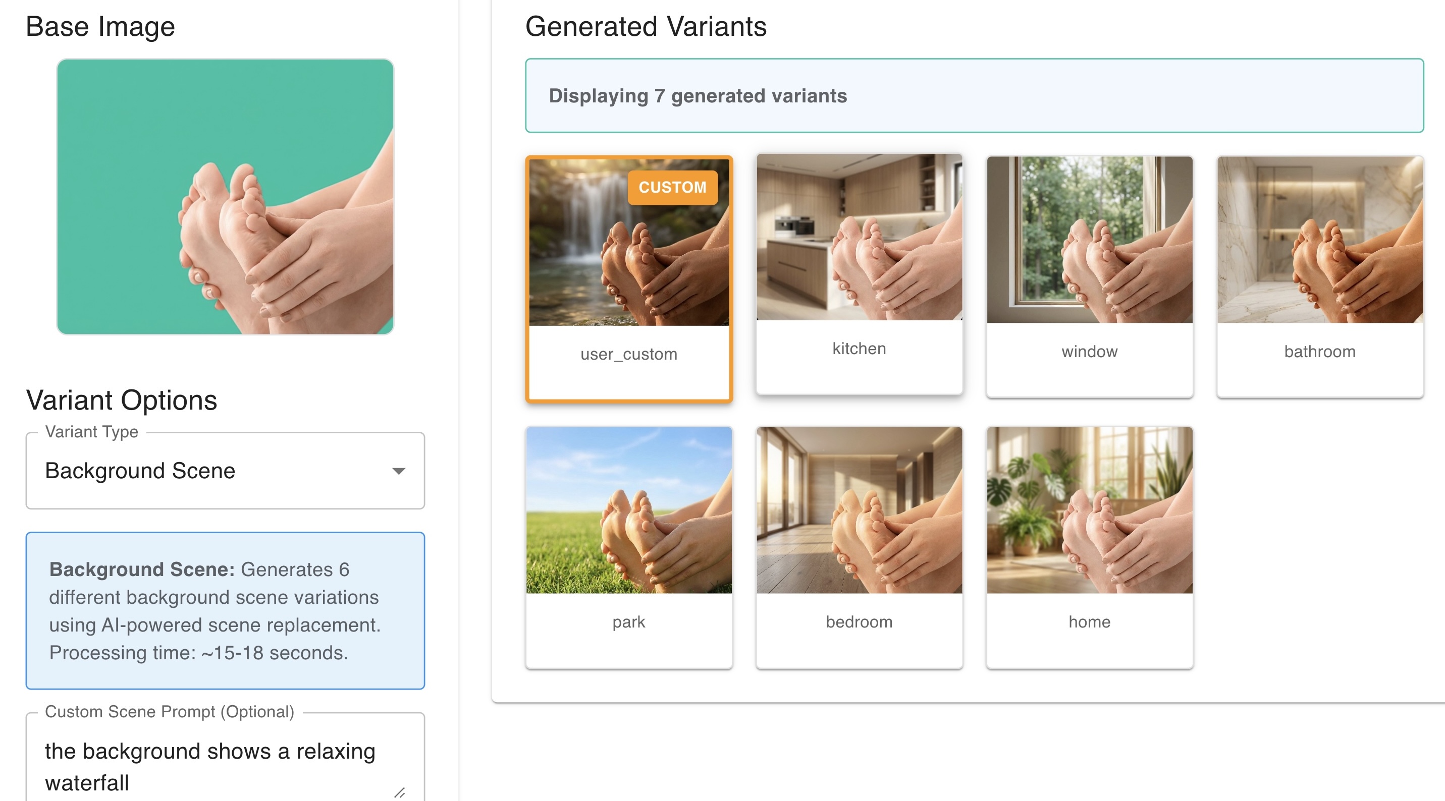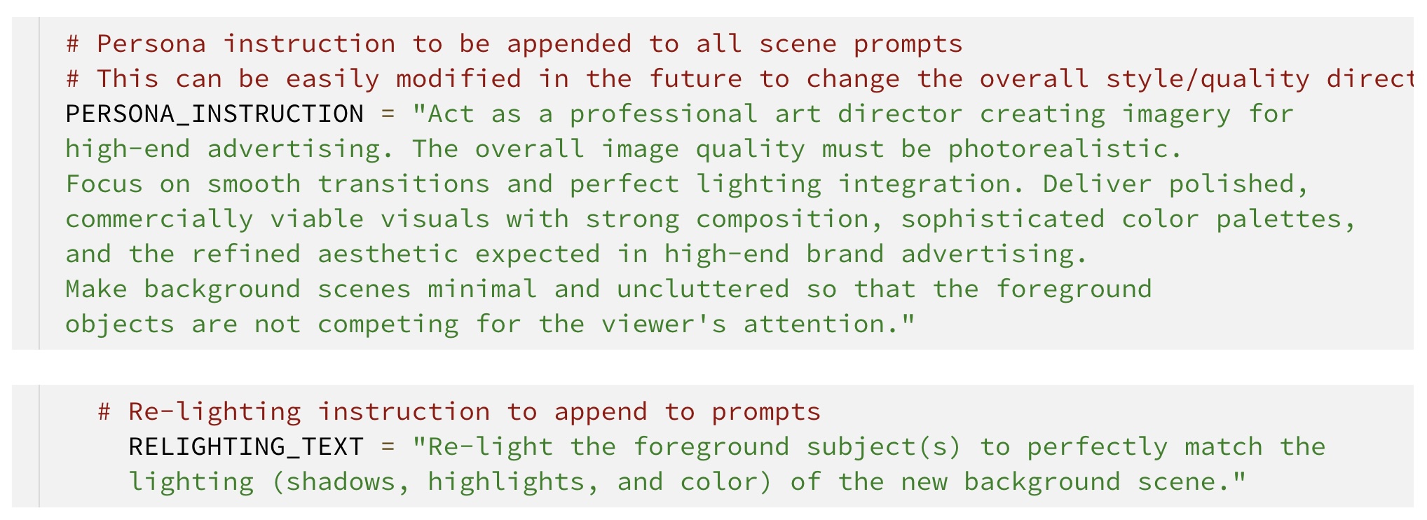 In the back-end additional structered prompts were used to ensure that important details of the source image such as ambient patterns and shapes or subtle shadows were preserved. There were also prompts to add realistic lighting and shading to the foreground images to match the lighting of the AI generated background images.