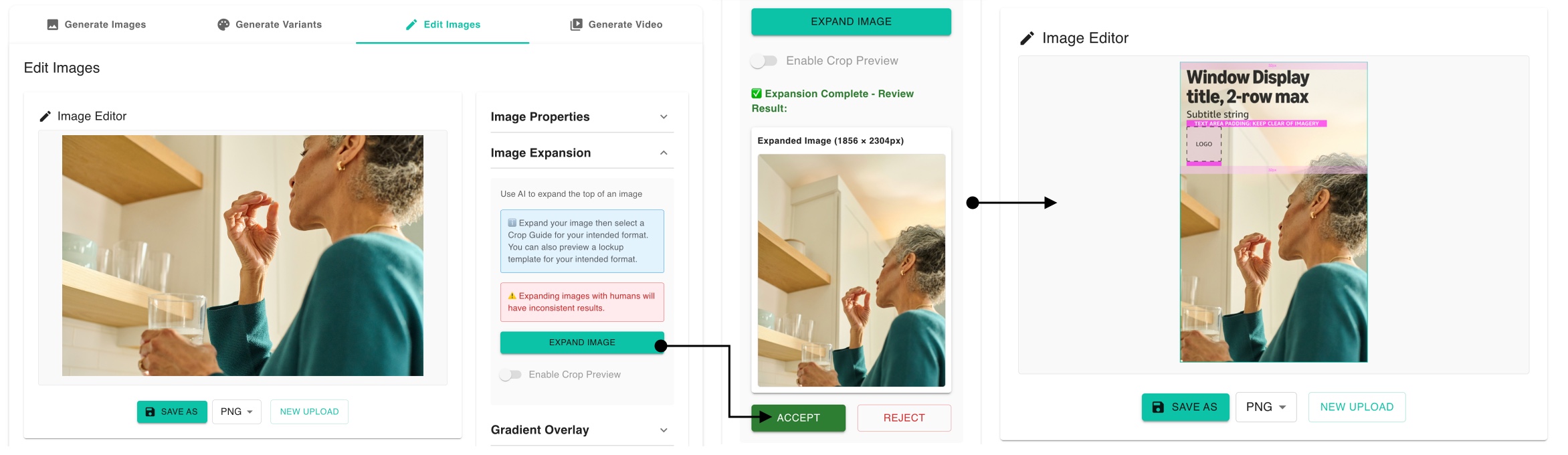 The LIT application enabled workflows to expand studio and stock photography by taking the detailed prompts required for out-painting and abstracting them to menu selection of marketing formats. Within the tool marketing lock-ups could be overlaid on the final images.