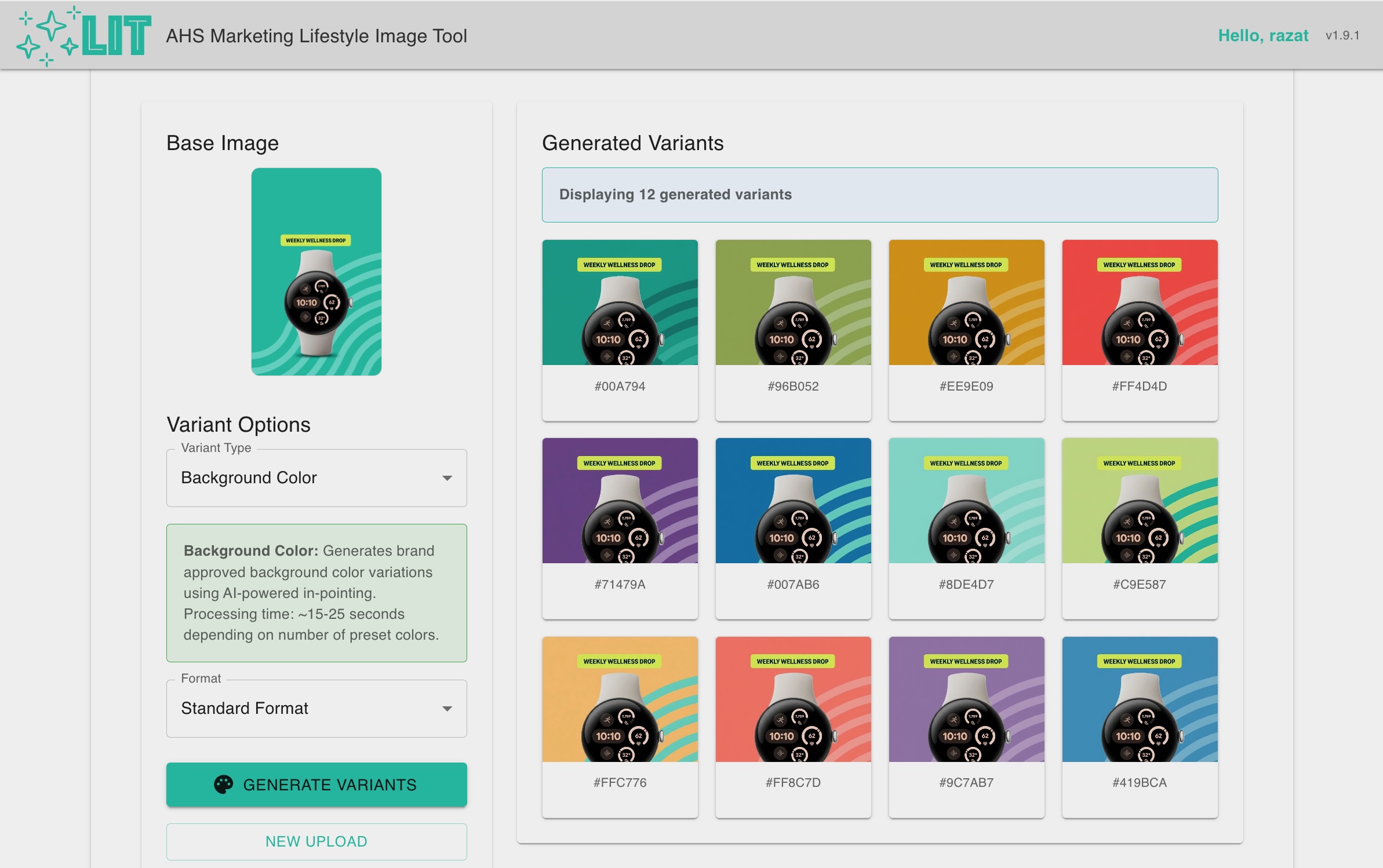 Marketing managers for Amazon Health Services (AHS) needed to conduct high-volume, data-driven marketing experiments quickly. Their workflow from creative brief, production and creative review took two to four weeks. Optimizing the workflow required a creative and easy solution to enable marketing managers to produce and modify high-quality lifestyle images.